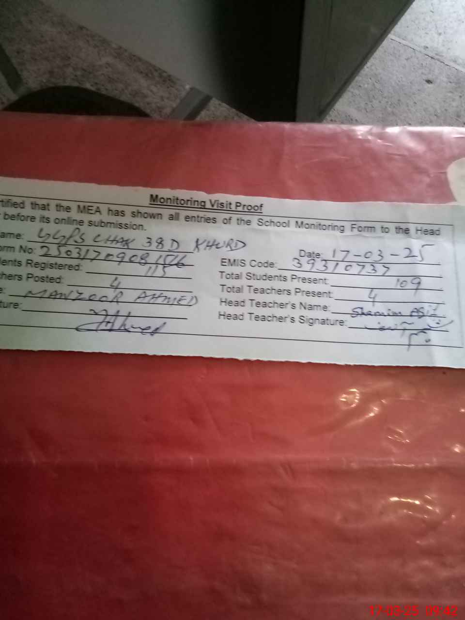 | Attendance Register | Head Teacher | MEA with School | Visit Proof |