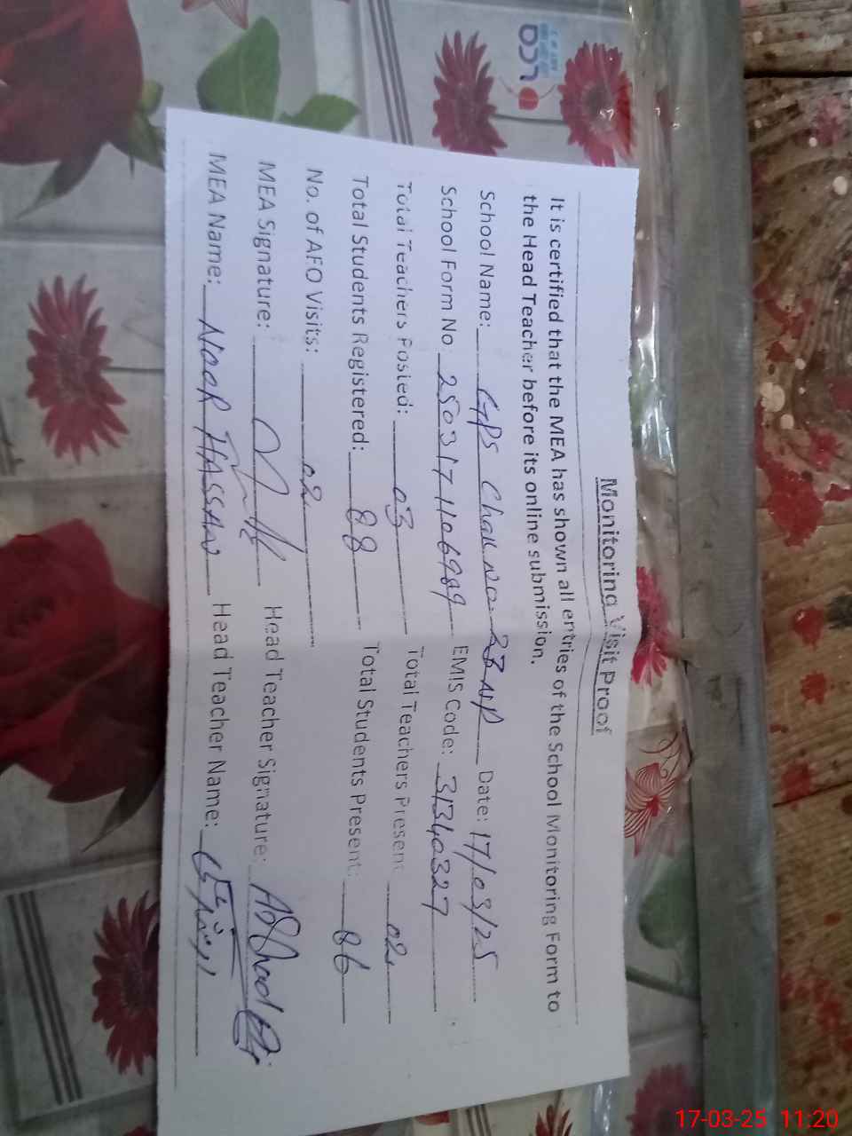 | Attendance Register | Head Teacher | MEA with School | Visit Proof |