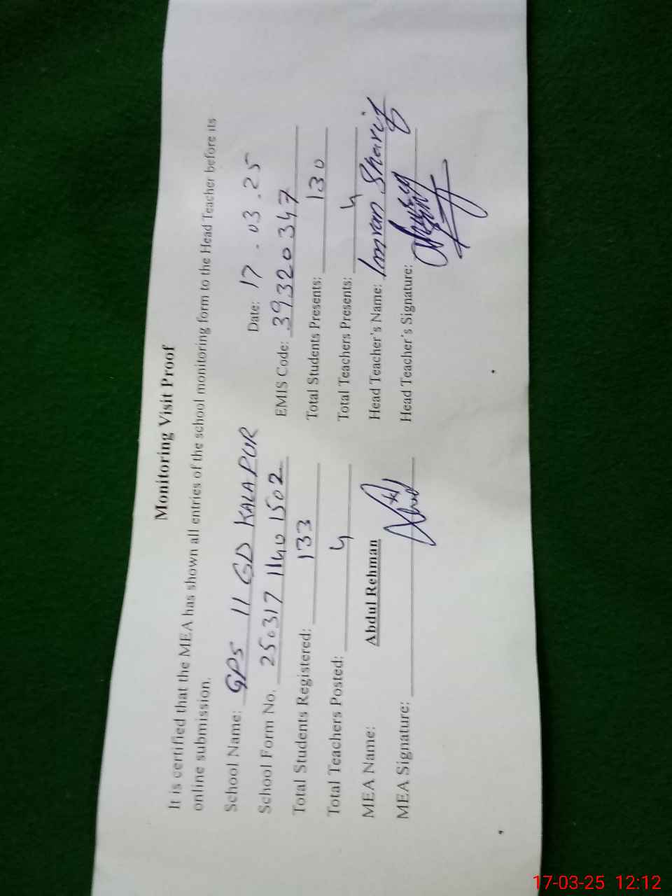 | Attendance Register | Head Teacher | MEA with School | Visit Proof |