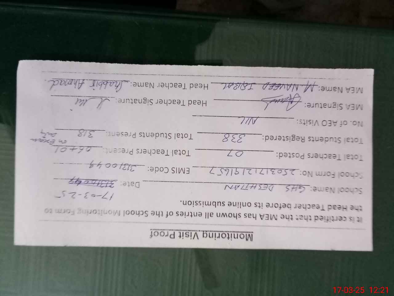 | Attendance Register | Head Teacher | MEA with School | Visit Proof |