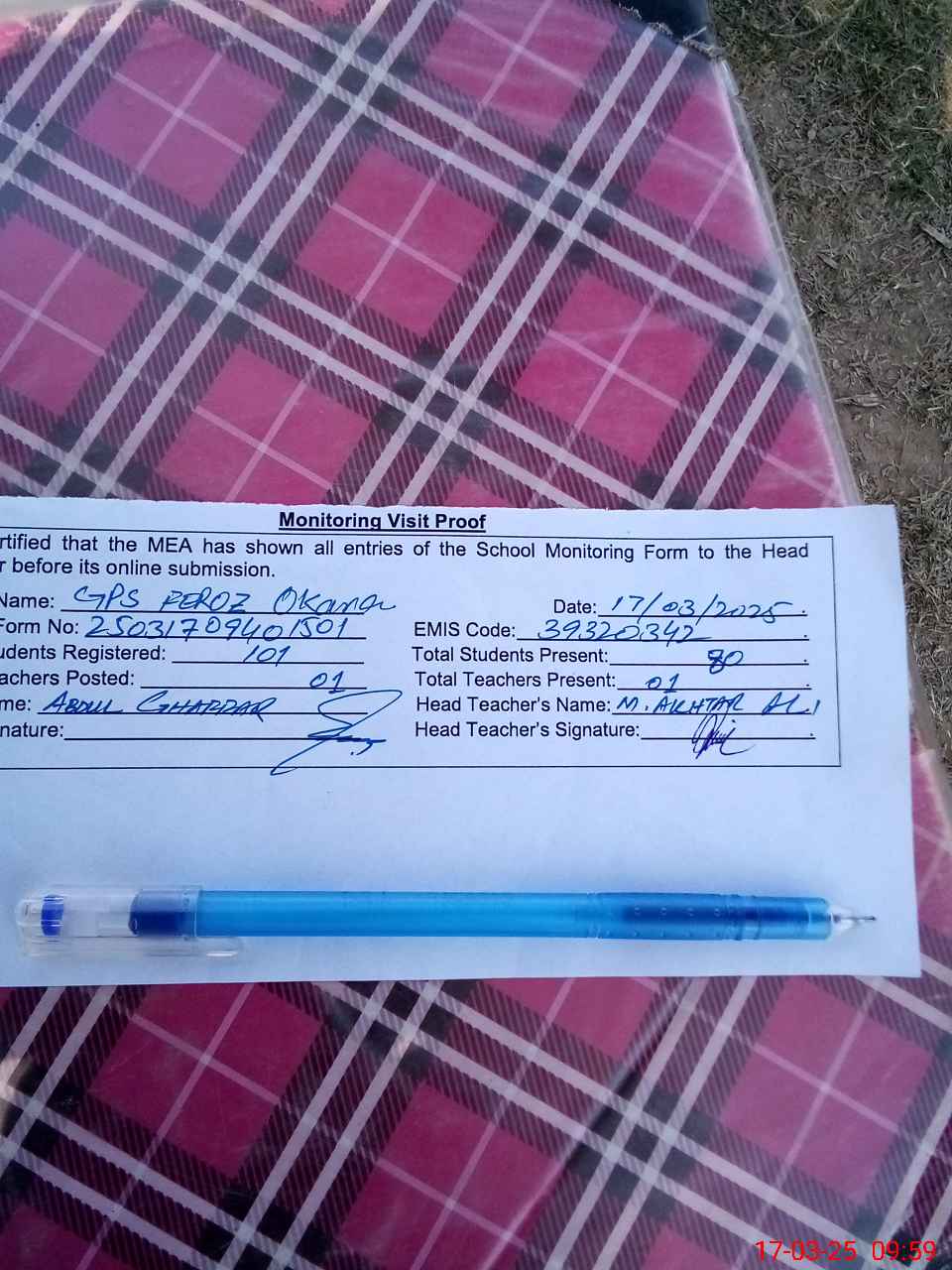 | Attendance Register | Head Teacher | MEA with School | Visit Proof |