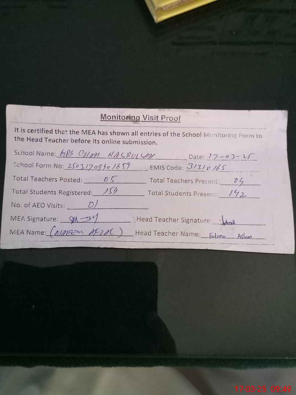 | Attendance Register | Head Teacher | MEA with School | Visit Proof |
