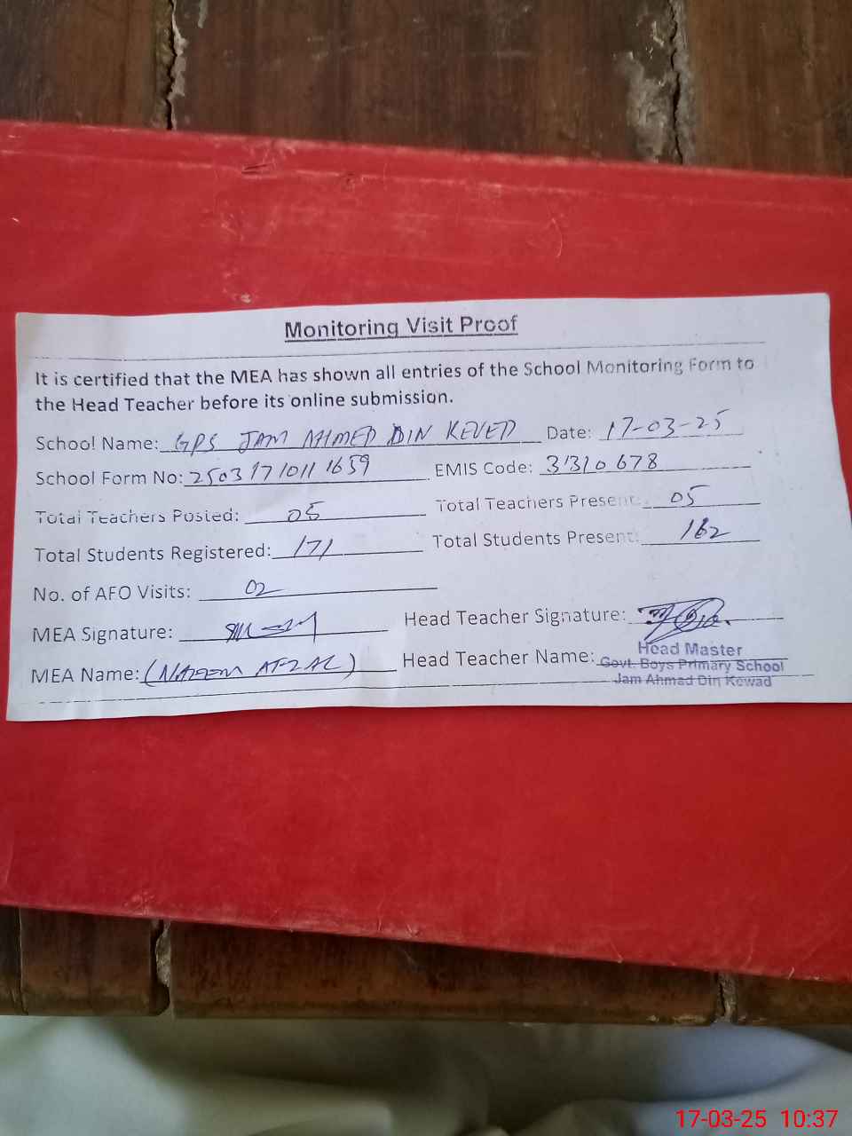 | Attendance Register | Head Teacher | MEA with School | Visit Proof |