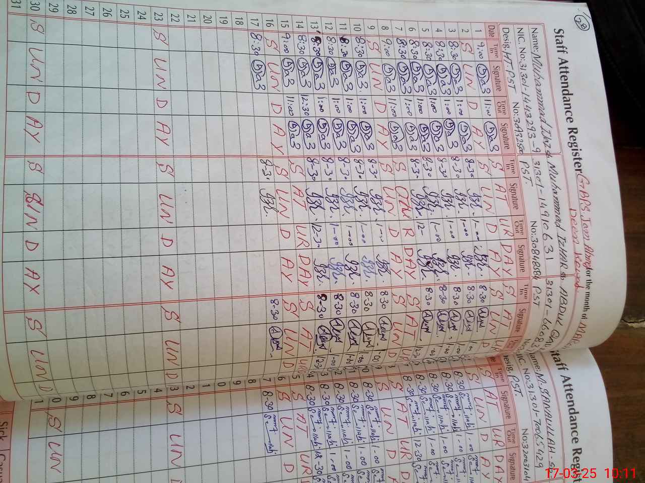 | CNIC | Full Name | Designation | R/C | Absence during last cal. month |
