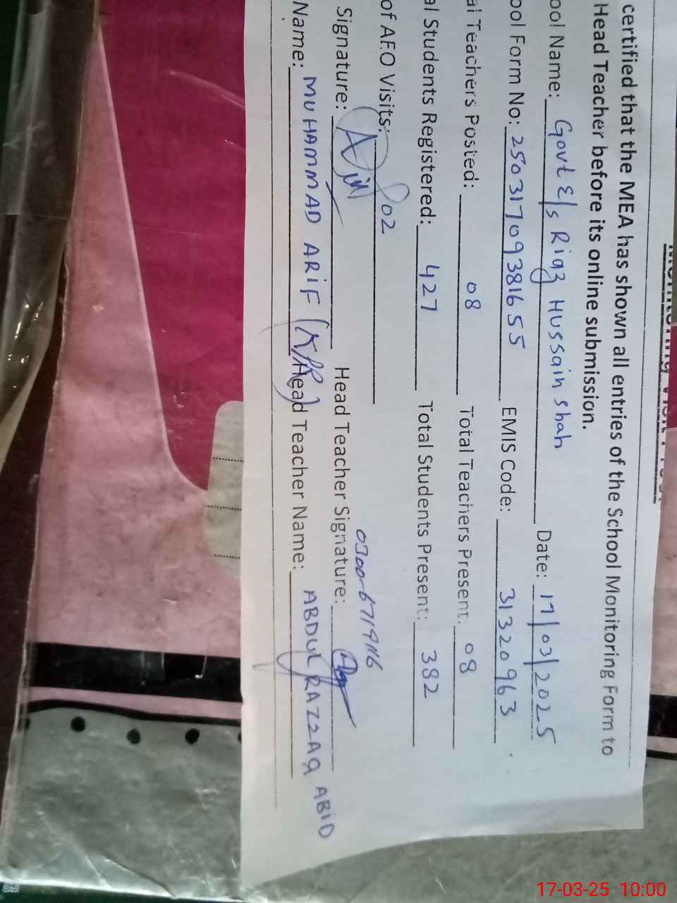 | Name: AB**** RA**** AB**** Designation: (School Headmaster's/Headmistress's) S S T Phone/Cell Number: 03**** |