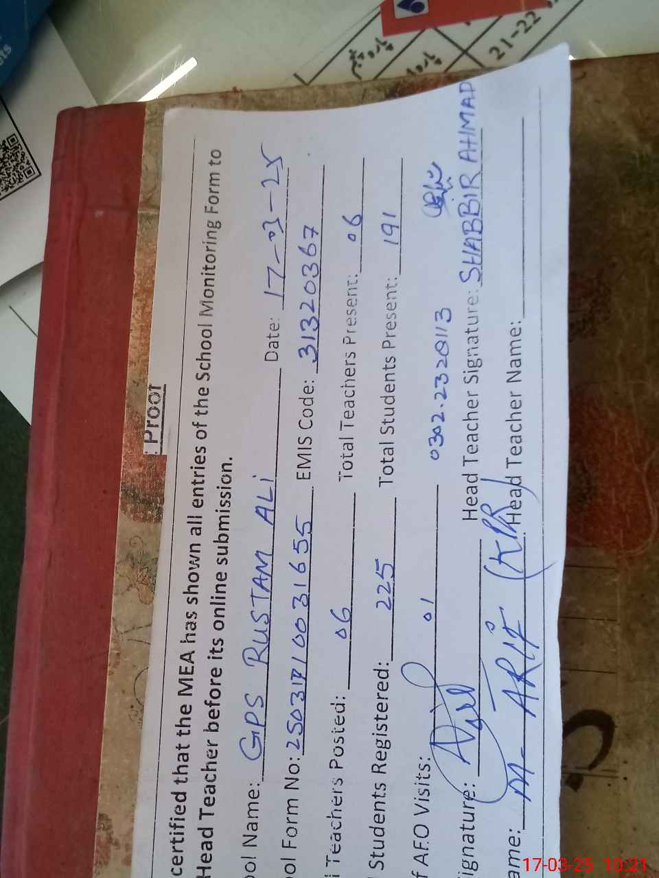 | Attendance Register | Head Teacher | MEA with School | Visit Proof |