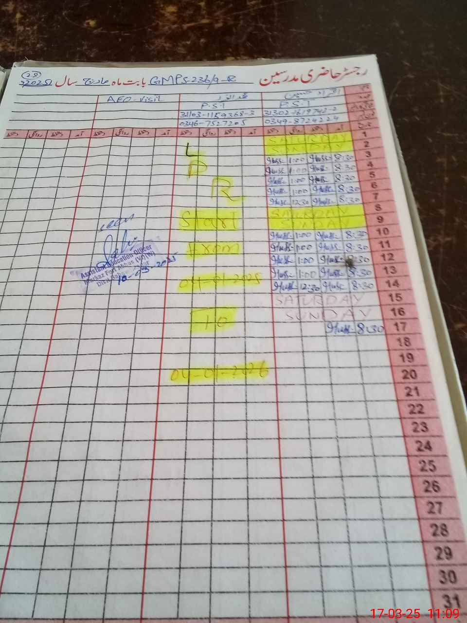 | Name: Iq**** Hu**** Designation: (School Headmaster's/Headmistress's) PST Phone/Cell Number: 03**** |