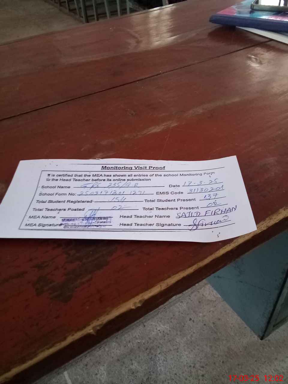 | Attendance Register | Head Teacher | MEA with School | Visit Proof |