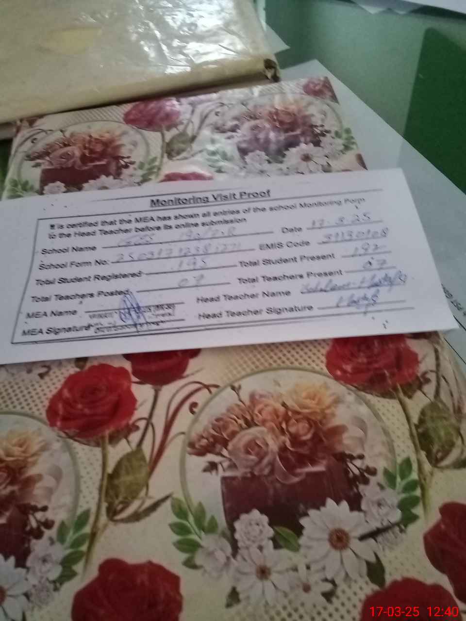 | Attendance Register | Head Teacher | MEA with School | Visit Proof |
