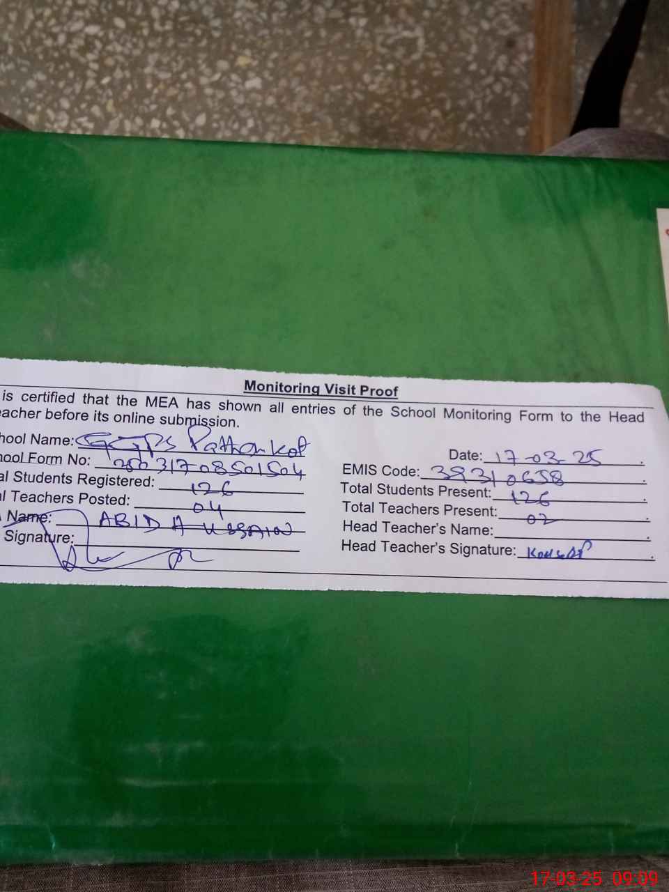| Attendance Register | Head Teacher | MEA with School | Visit Proof |