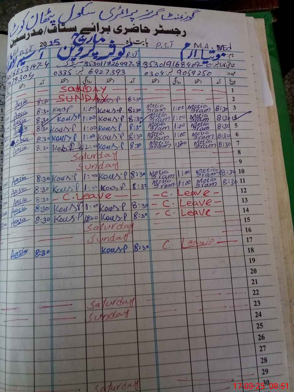 | Name: Mo**** Er**** Designation: (School Headmaster's/Headmistress's) ESE SCI MATH Phone/Cell Number: 03**** |