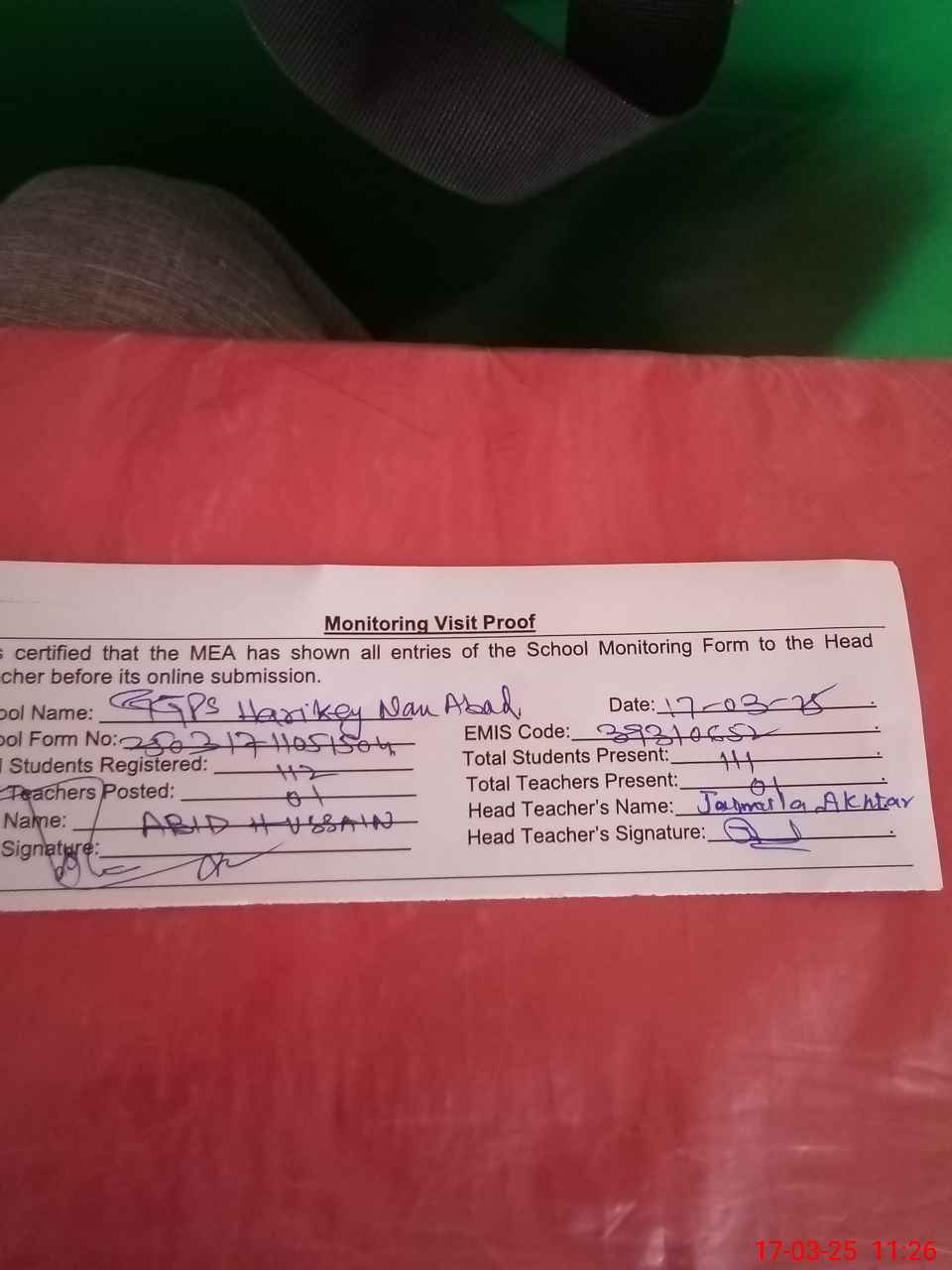 | Attendance Register | Head Teacher | MEA with School | Visit Proof |