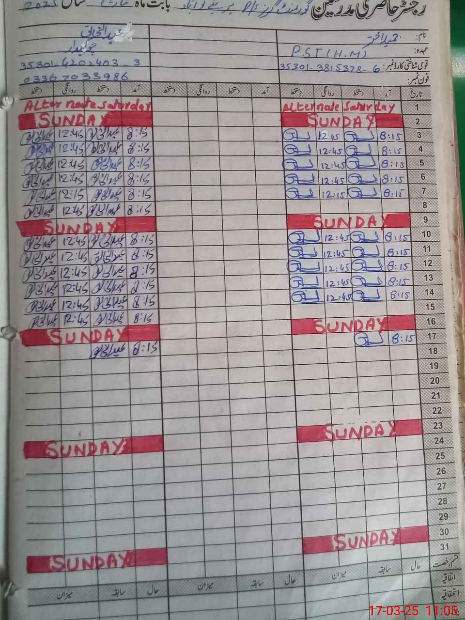 | CNIC | Full Name | Designation | R/C | Absence During Last Calender Month |
