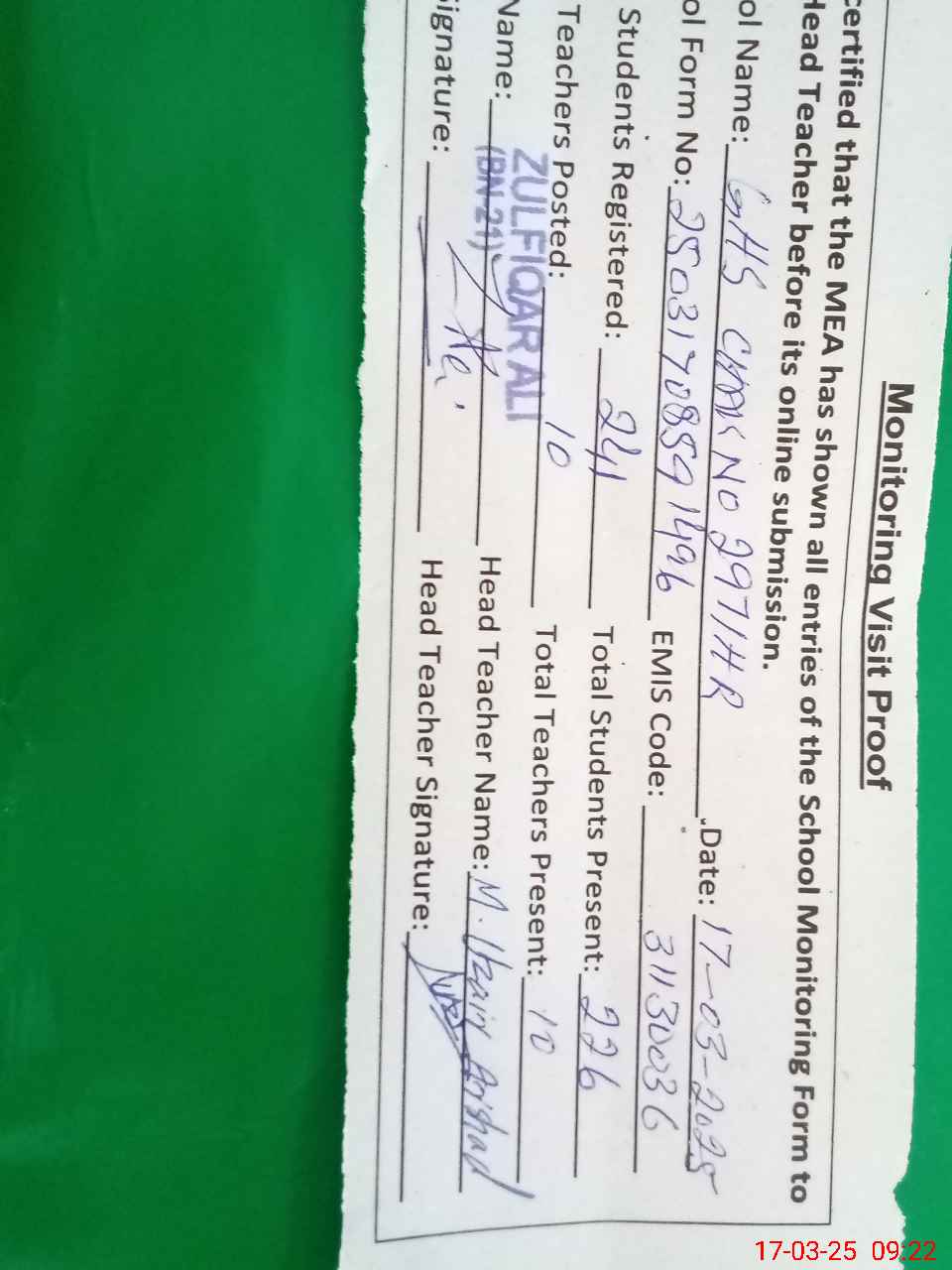 | Name: Mu**** Uz**** Ar**** Designation: (School Headmaster's/Headmistress's) SST CS Phone/Cell Number: 03**** |