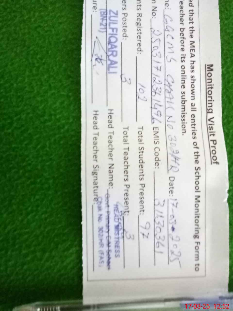 | Attendance Register | Head Teacher | MEA with School | Visit Proof |