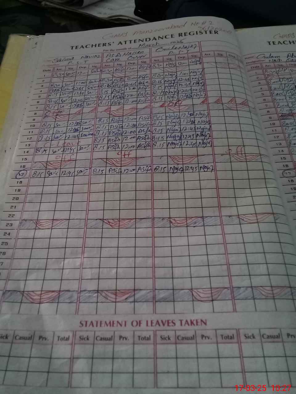 | Remarks (Use Separate Page if Required): Saima Nawaz pst joined this school on 14 December 2024 Gul najaf is on temporary duty in this school from ggps khagay wala | |||||