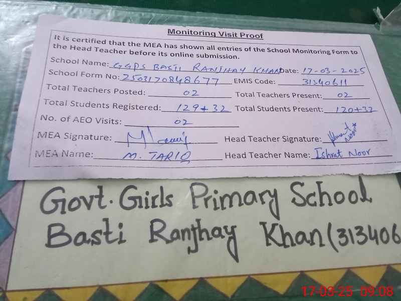 | EMIS Code: 31340611 | Name of School: GGPS BASTI RANJHAY KHAN | |||