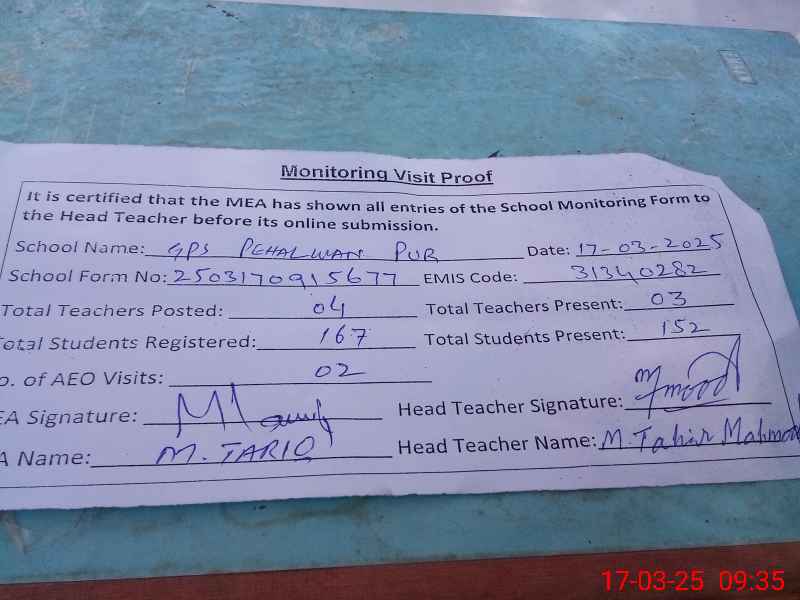 | EMIS Code: 31340282 | Name of School: GPS PEHLWAN PUR | |||