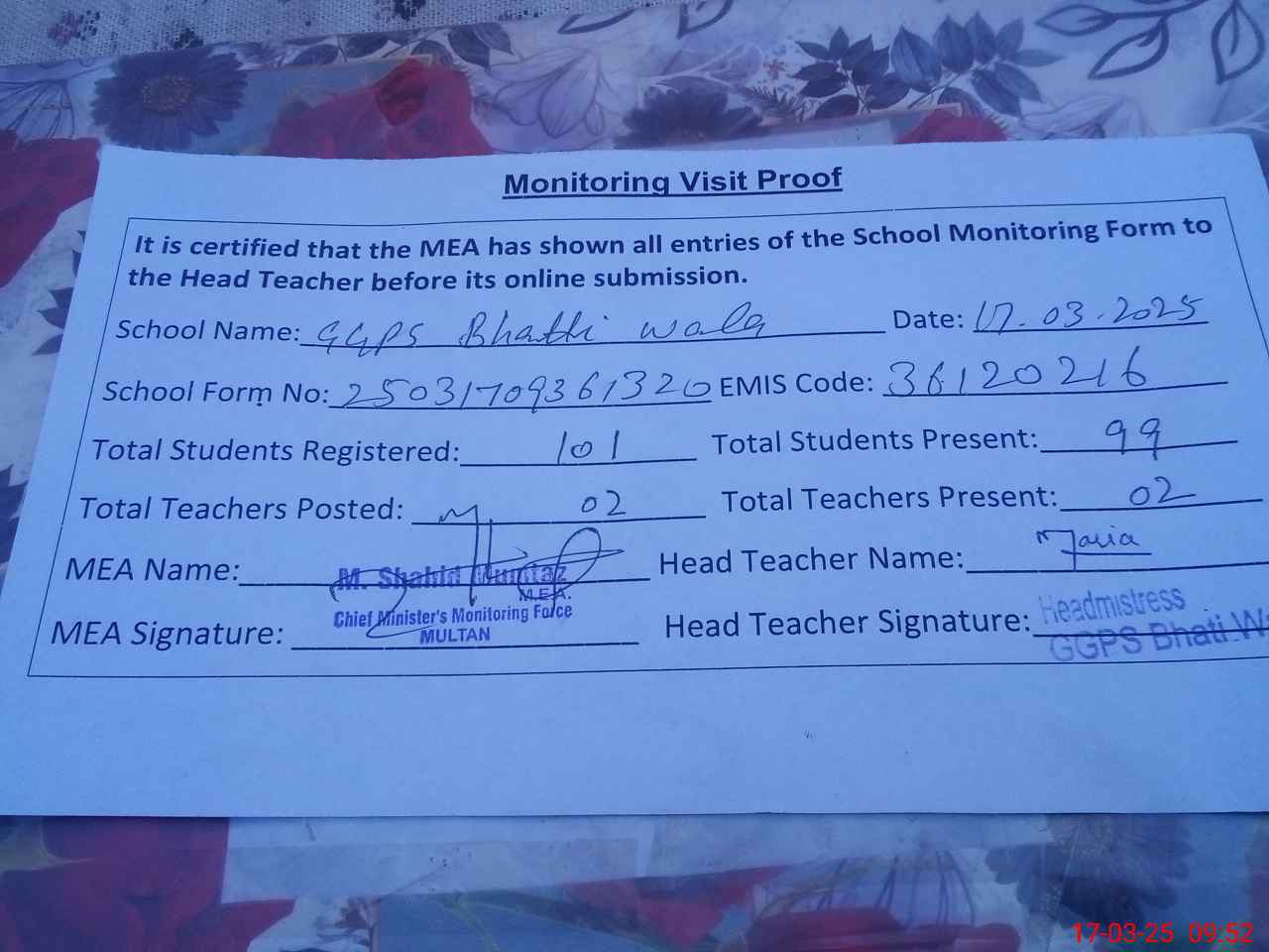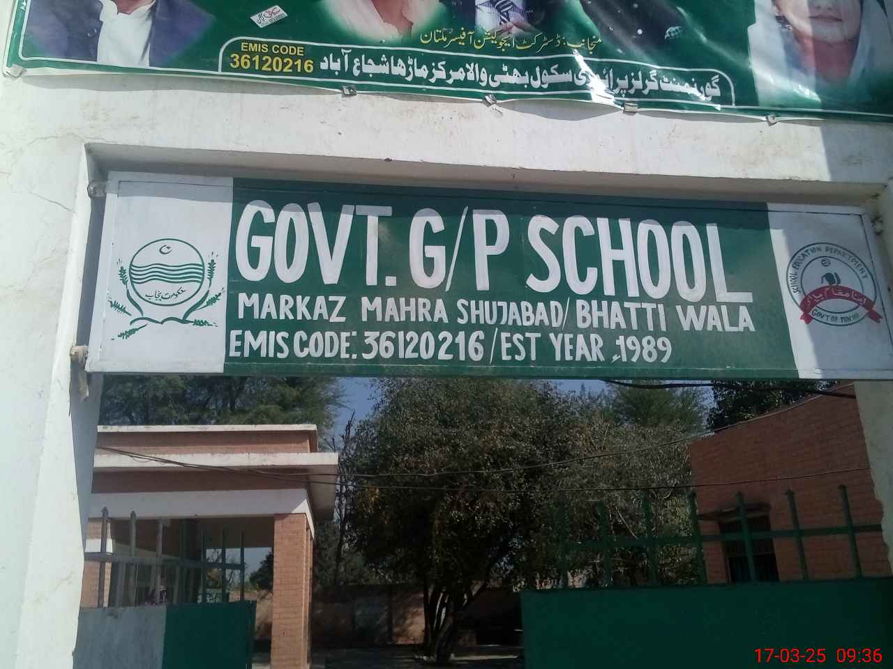| EMIS Code: 36120216 | Name of School: GGPS BHATTI WALA SHUJABAD | |||