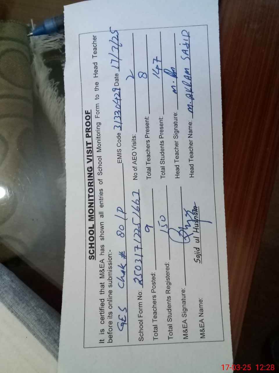 | Attendance Register | Head Teacher | MEA with School | Visit Proof |