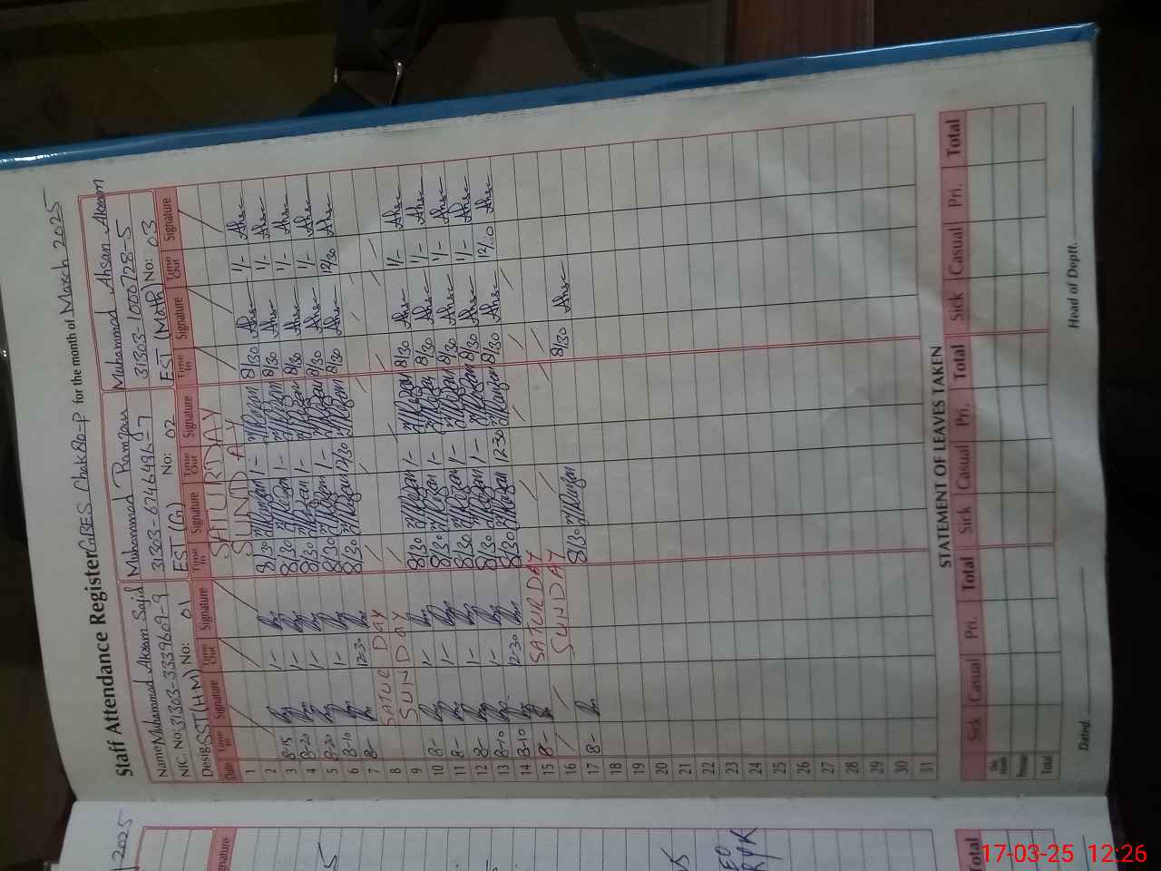 | CNIC | Full Name | Designation | R/C | Absence During Last Calender Month |