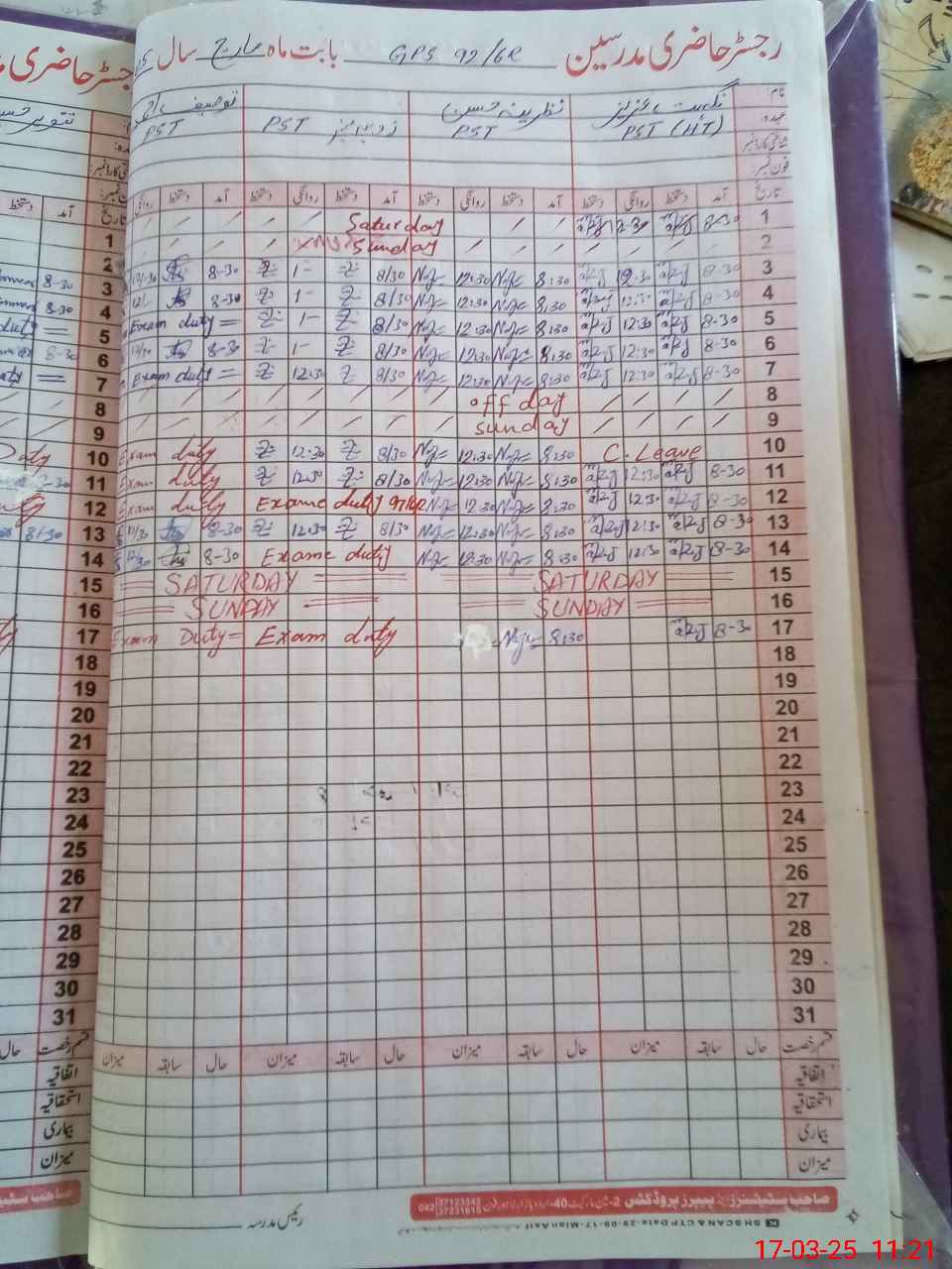 | 31**** | Ta**** Ah**** | PST | Regular | 0 | 0 | 0 | 0 | 0 | 0 | 0 | 0 | 0 | Exam Duty |
