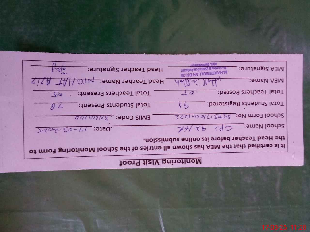 | Attendance Register | Head Teacher | MEA with School | Visit Proof |