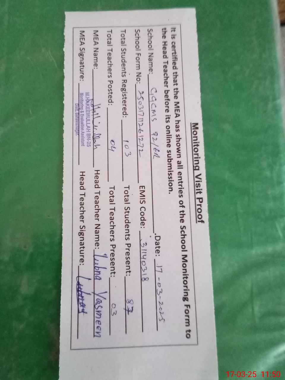 | Attendance Register | Head Teacher | MEA with School | Visit Proof |