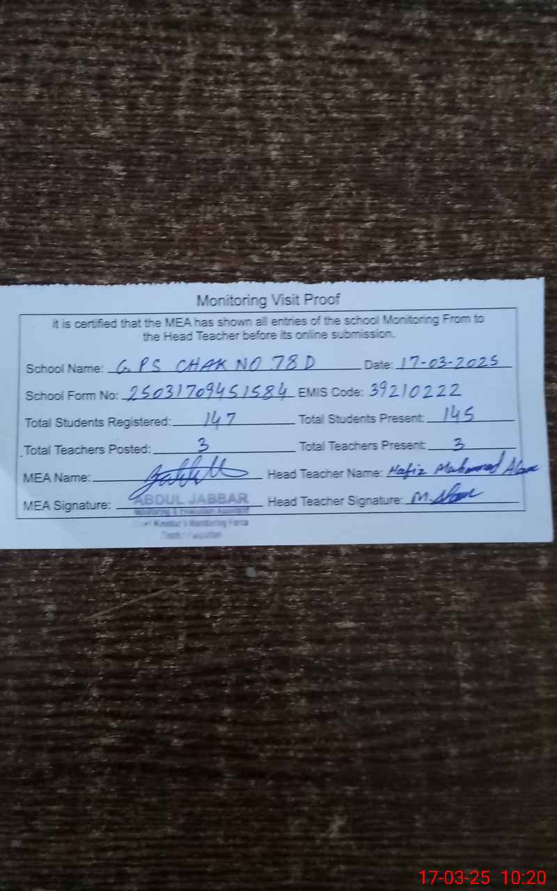 | EMIS Code: 39210222 | Name of School: GPS CHAK NO. 78/D | |||