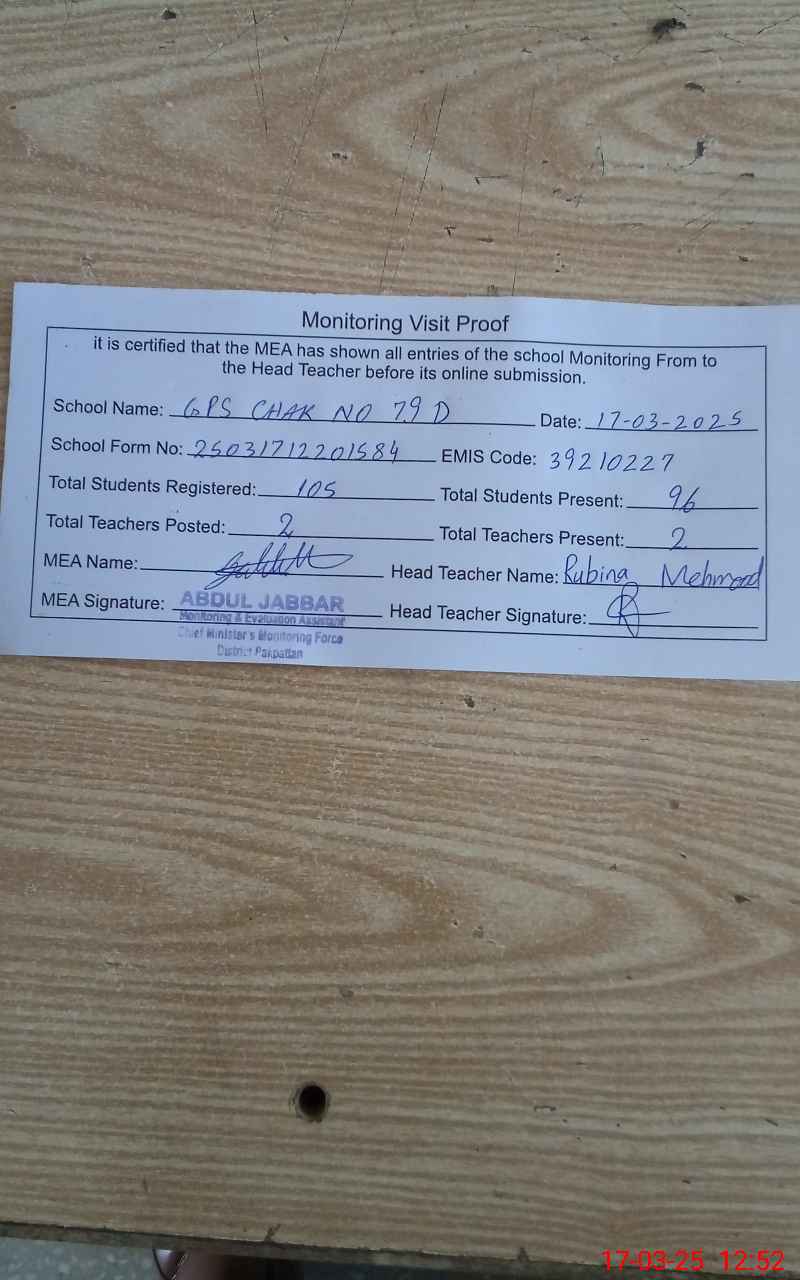 | EMIS Code: 39210227 | Name of School: GPS CHAK NO. 79 D | |||