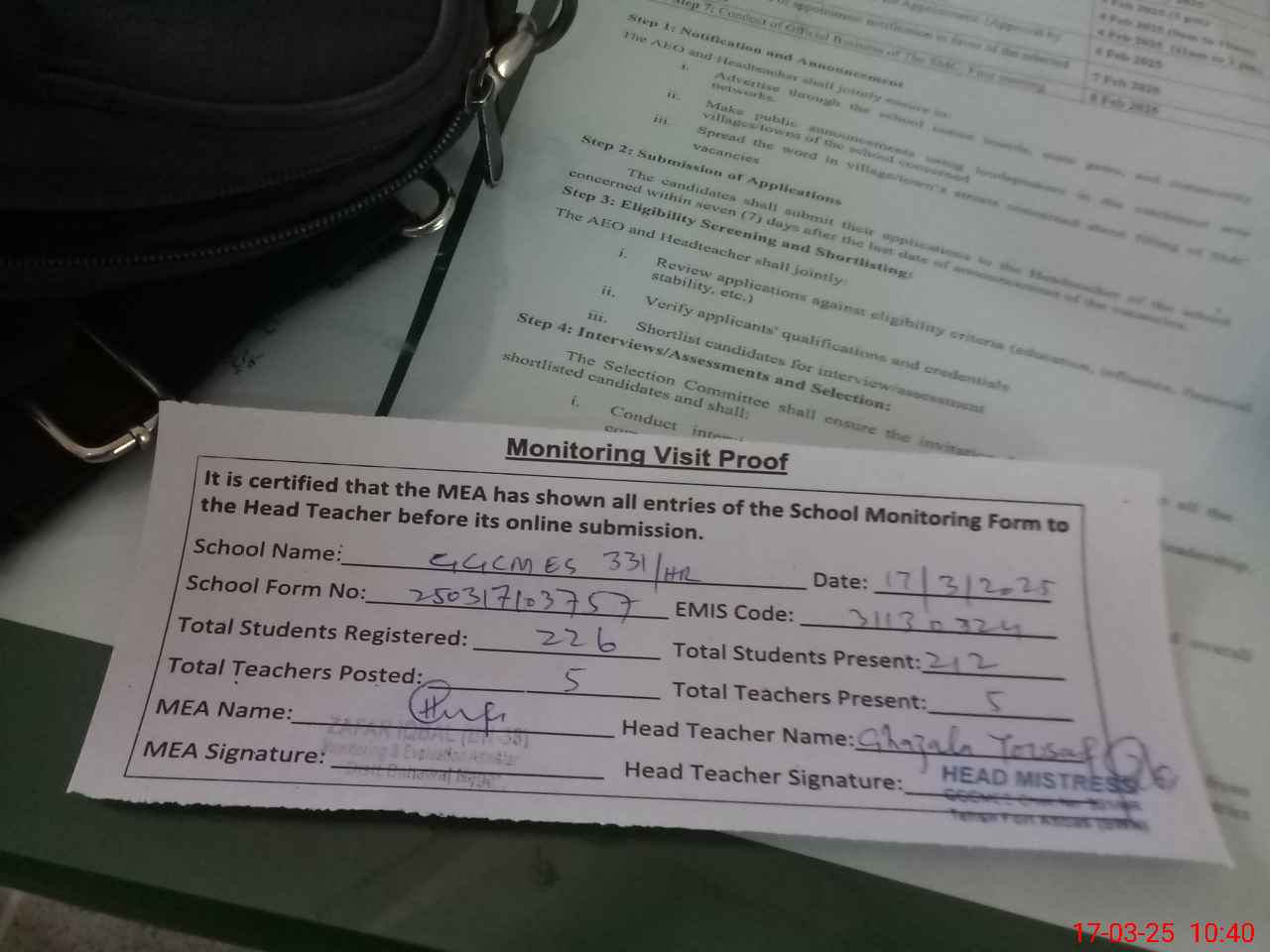 | Attendance Register | Head Teacher | MEA with School | Visit Proof |