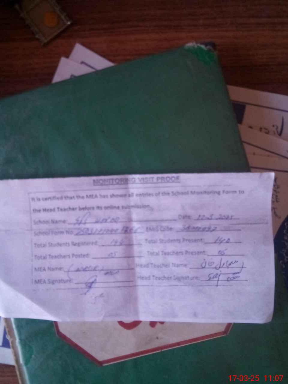 | Attendance Register | Head Teacher | MEA with School | Visit Proof |