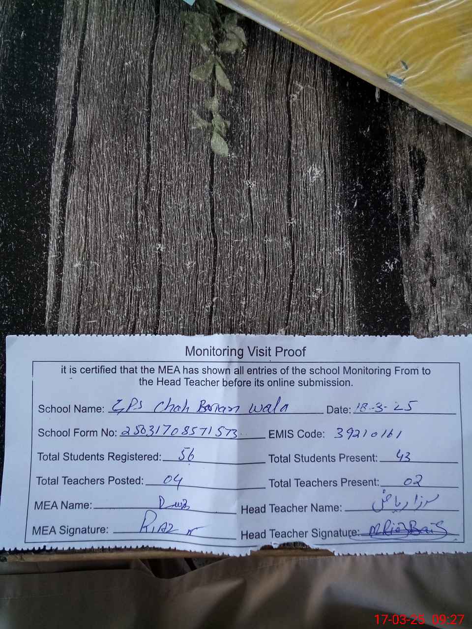 | Attendance Register | Head Teacher | MEA with School | Visit Proof |