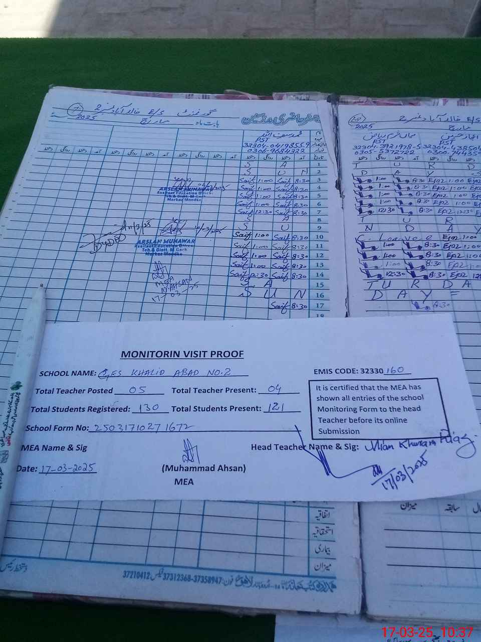 | Attendance Register | Head Teacher | MEA with School | Visit Proof |