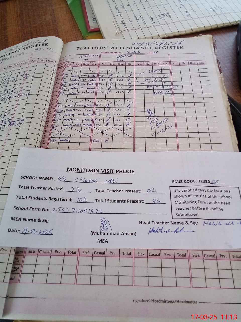 | Attendance Register | Head Teacher | MEA with School | Visit Proof |