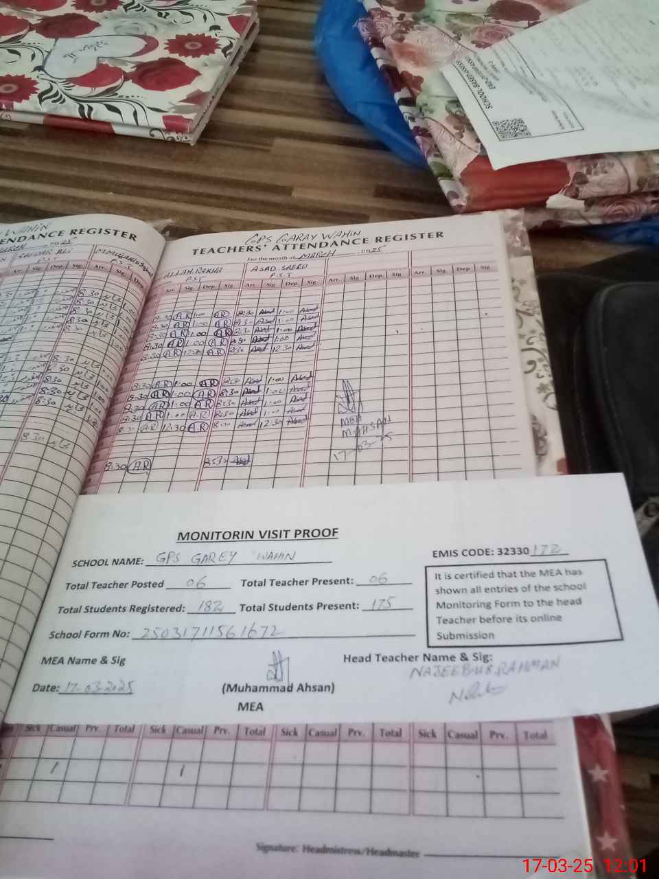 | Attendance Register | Head Teacher | MEA with School | Visit Proof |