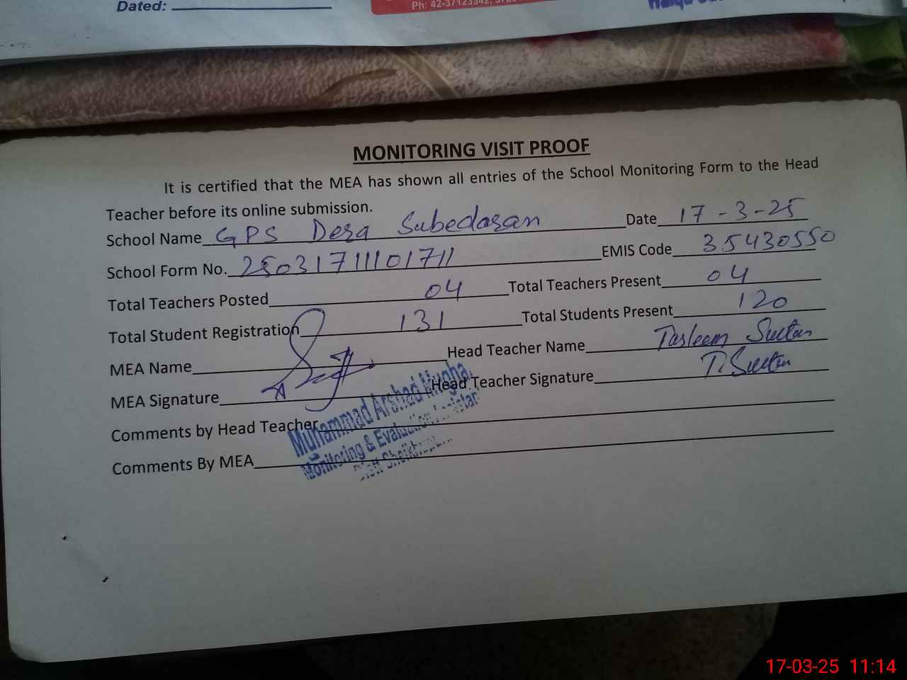| Attendance Register | Head Teacher | MEA with School | Visit Proof |