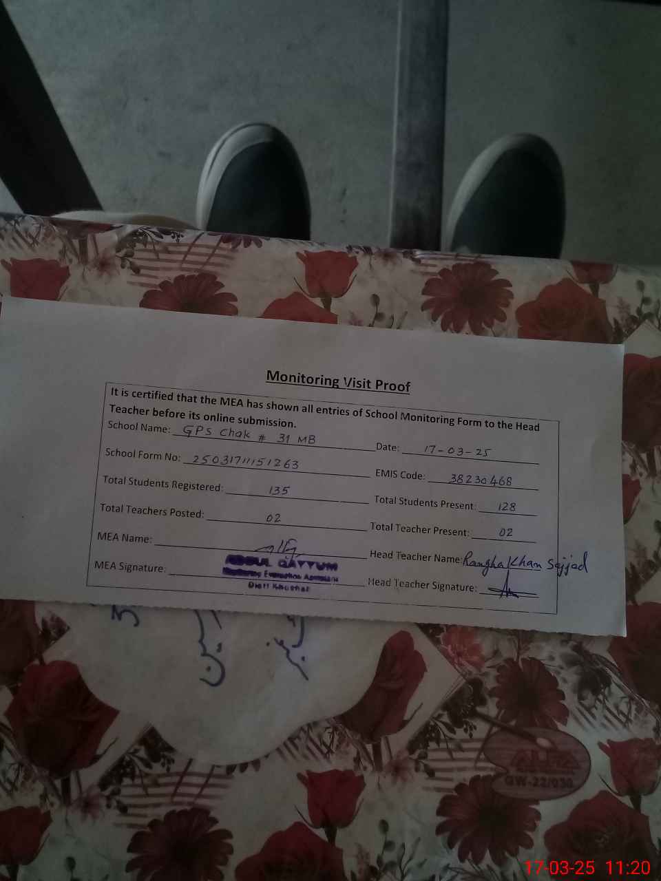 | EMIS Code: 38230468 | Name of School: GPS CHAK NO. 31 MB | |||