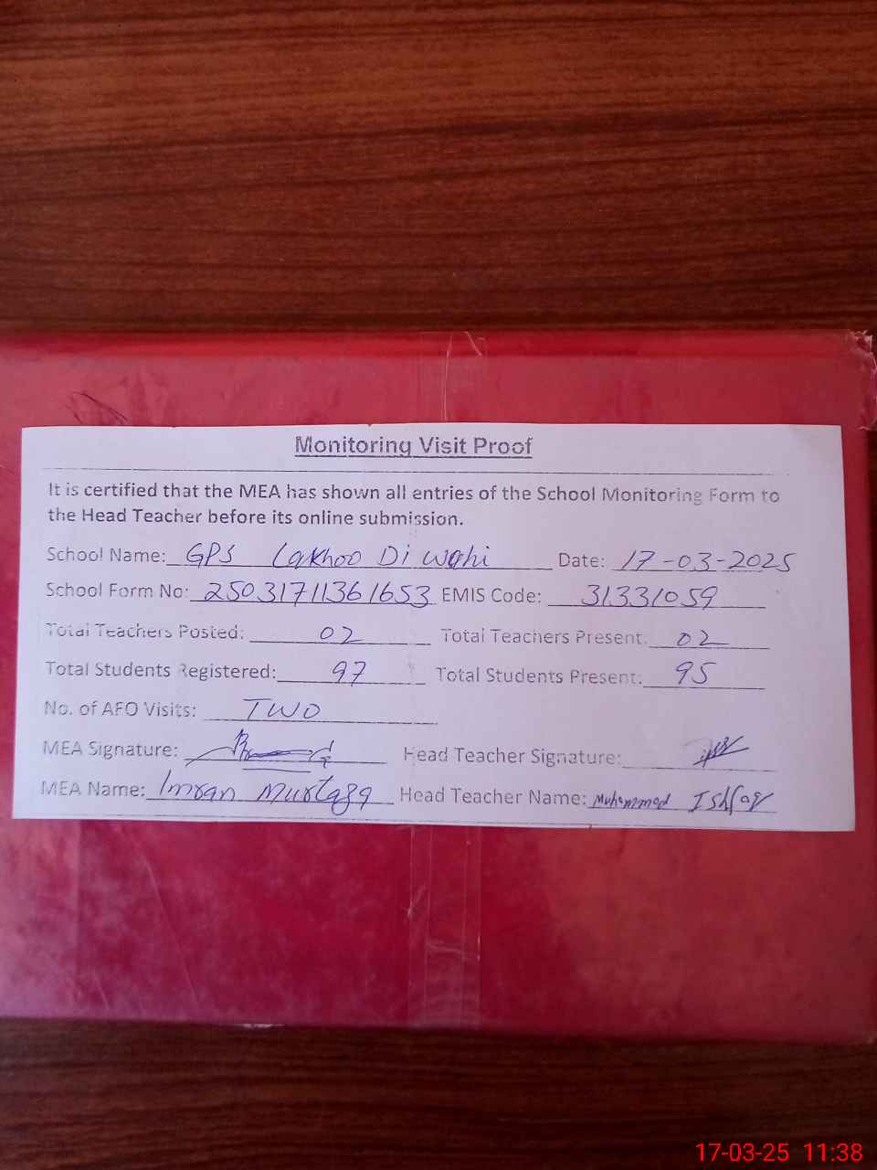 | EMIS Code: 31331059 | Name of School: GPS LAKHOO DI WAHI | |||