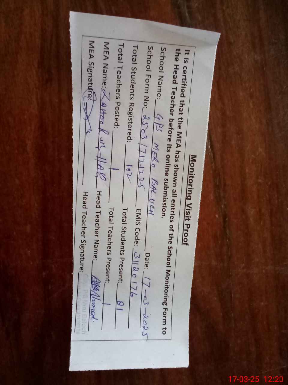 | Attendance Register | Head Teacher | MEA with School | Visit Proof |