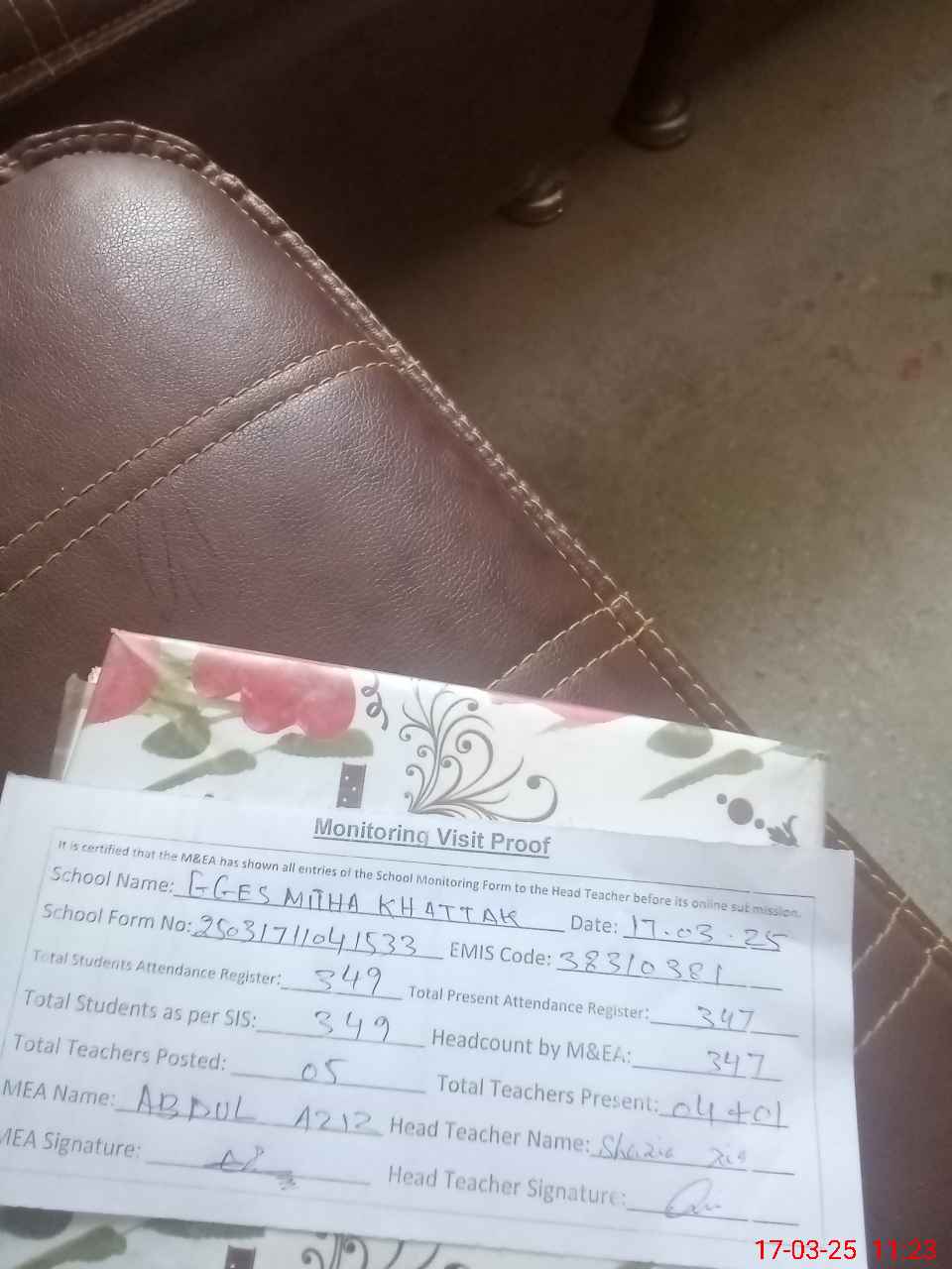 | Attendance Register | Head Teacher | MEA with School | Visit Proof |