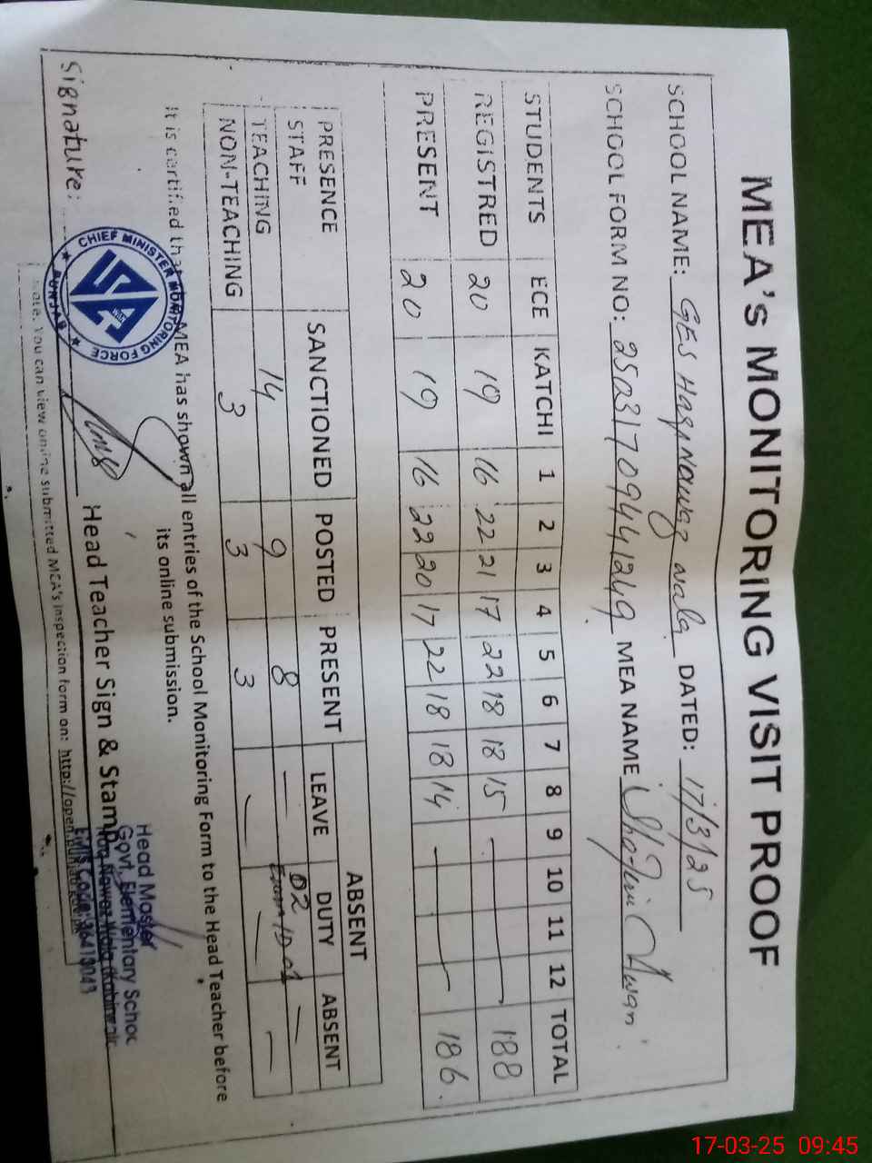 | Attendance Register | Head Teacher | MEA with School | Visit Proof |