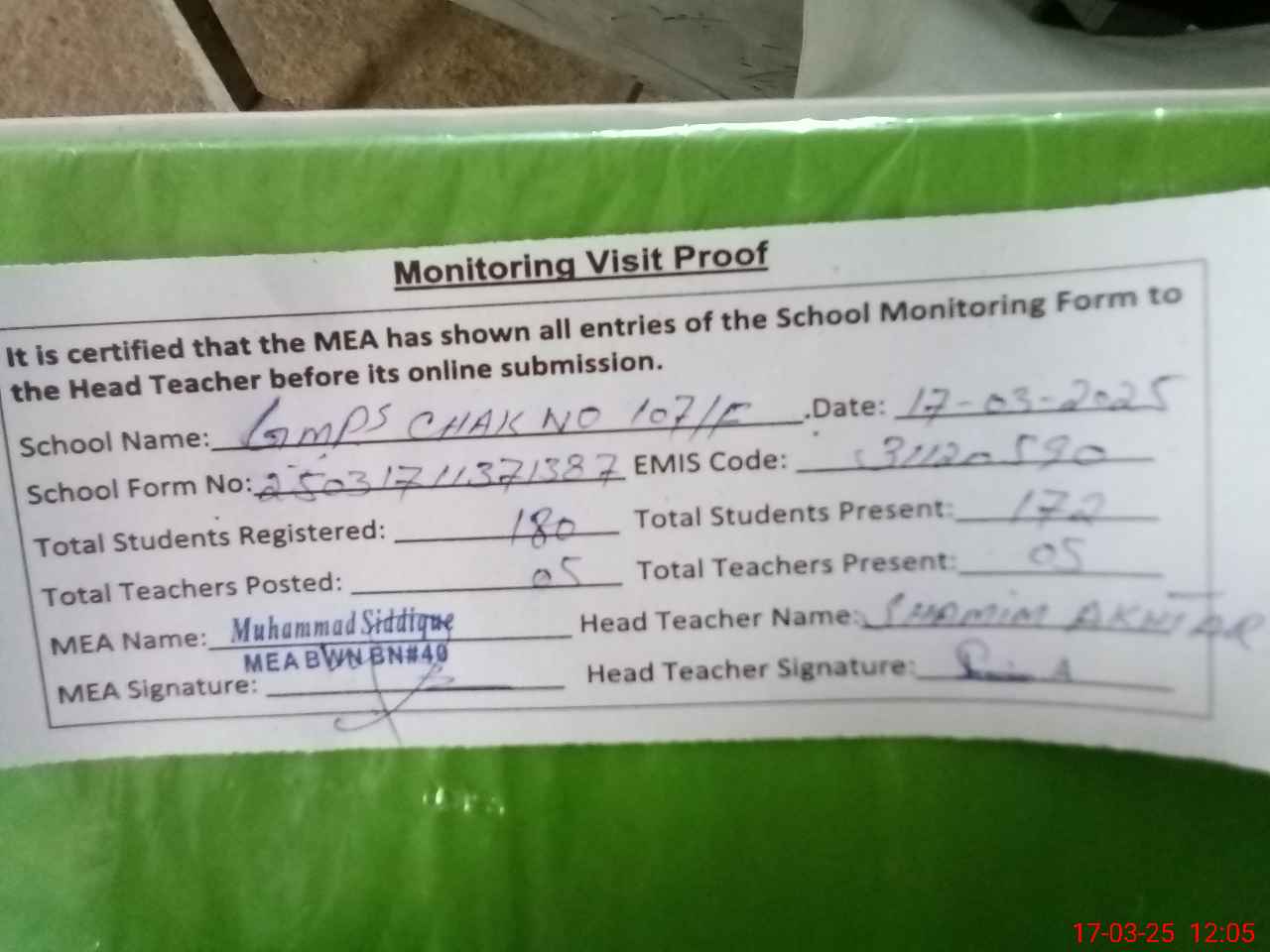 | Attendance Register | Head Teacher | MEA with School | Visit Proof |