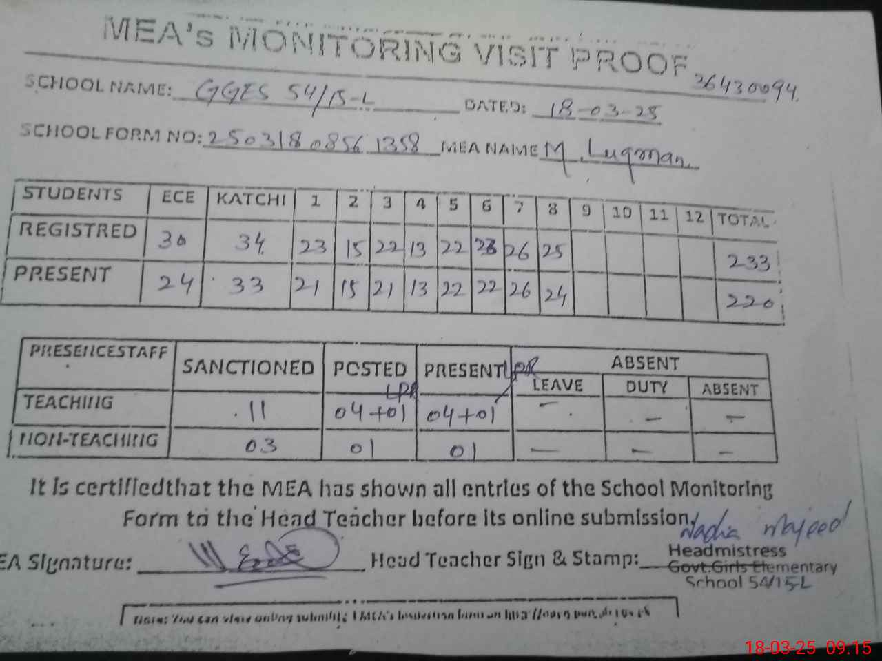 | Attendance Register | Head Teacher | MEA with School | Visit Proof |
