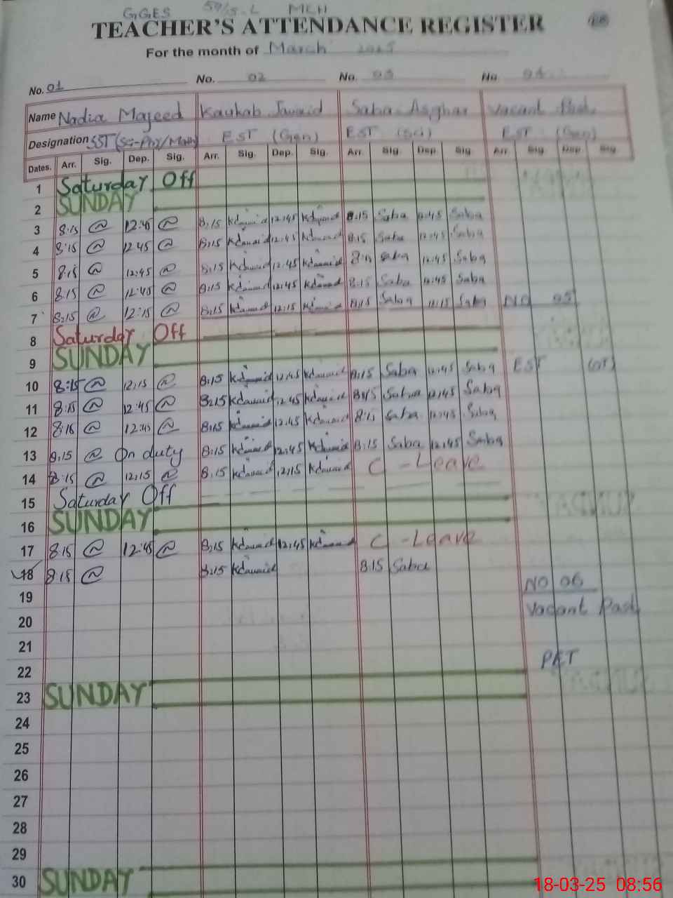 | No. of Students Present - Male | 6 | 0 | 12 | 6 | 5 | 3 | 3 | 2 | 0 | 0 | 0 | 37 | ||||