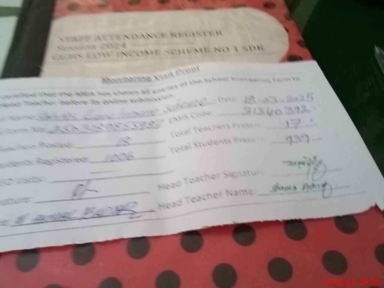| Attendance Register | Head Teacher | MEA with School | Visit Proof |