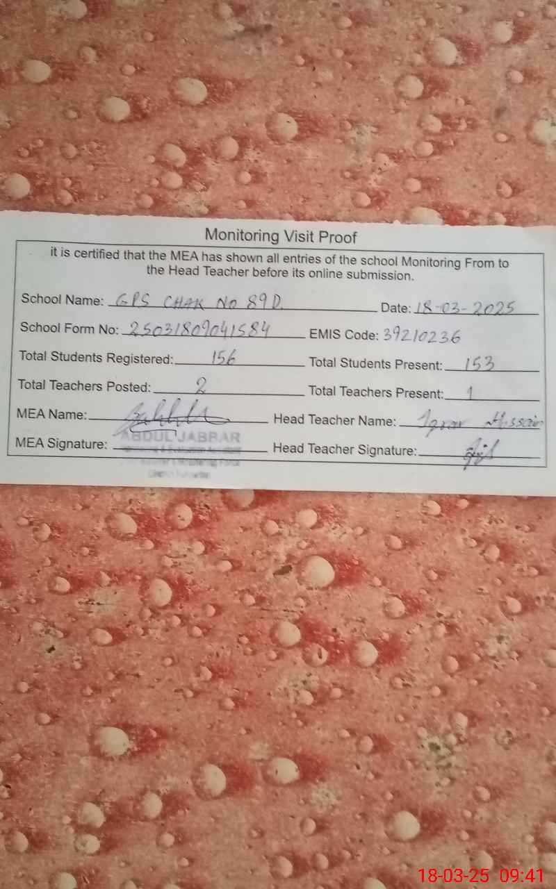 | EMIS Code: 39210236 | Name of School: GPS CHAK NO. 89 /D | |||