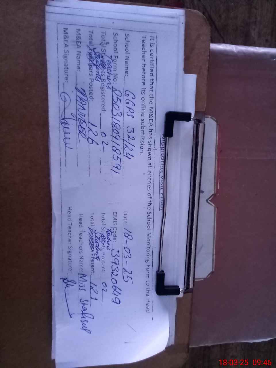 | Attendance Register | Head Teacher | MEA with School | Visit Proof |