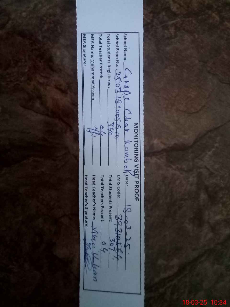| Attendance Register | Head Teacher | MEA with School | Visit Proof |