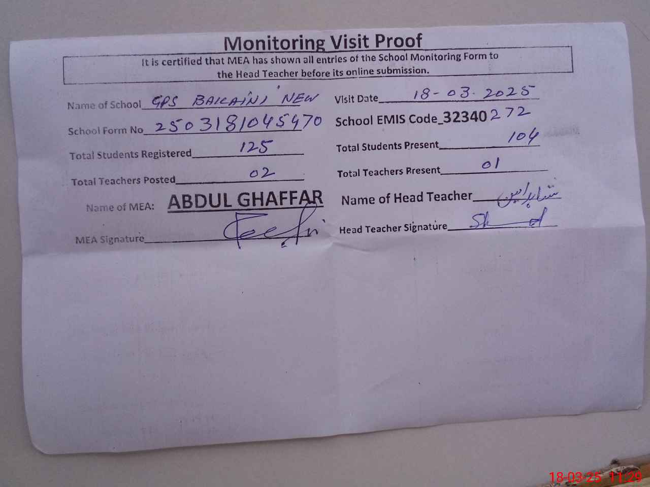 | Attendance Register | Head Teacher | MEA with School | Visit Proof |
